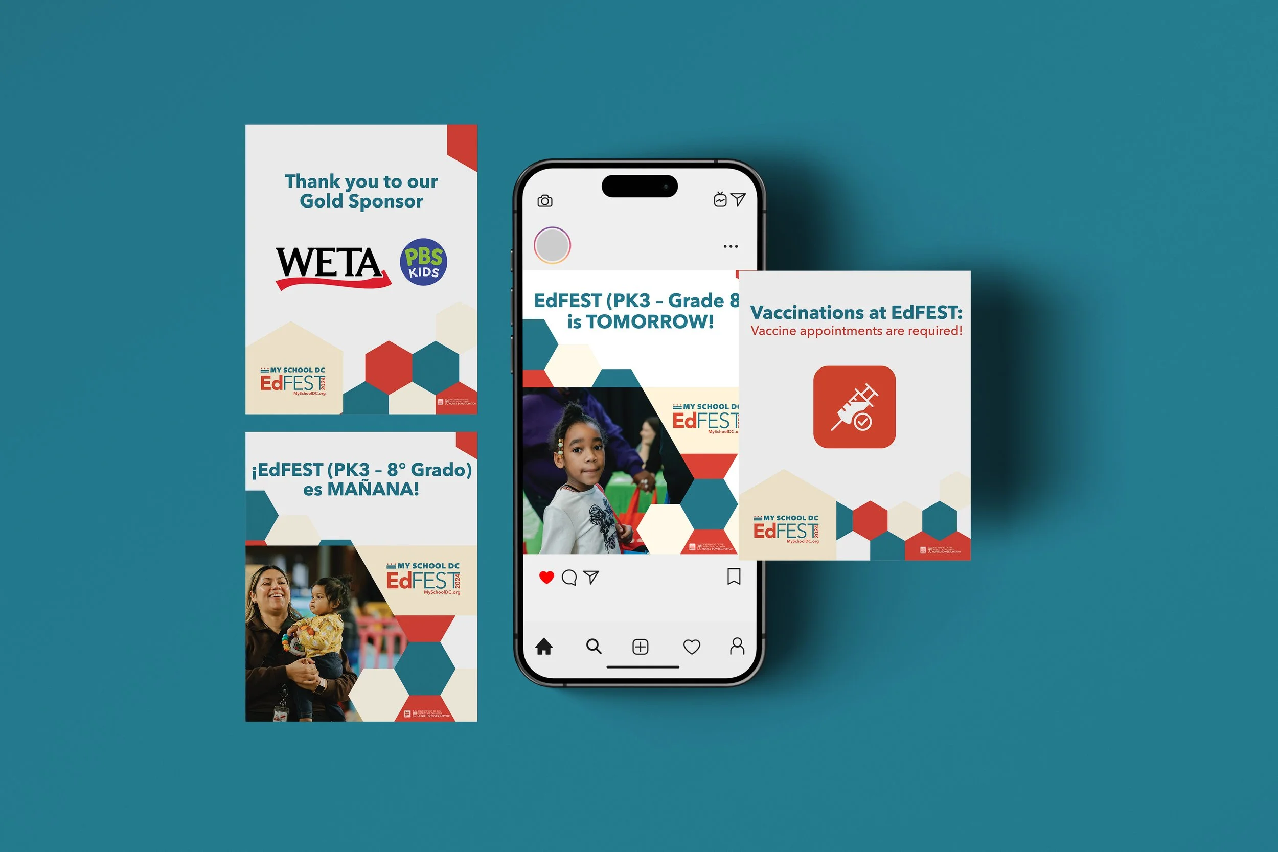 For their biggest event of the year, I wanted to design a concept that could clearly be recognized as a My School DC event but also stand out as the EdFEST design. The approach I was to keep their bold colors unaltered and creating a visual pattern that was fun and versatile. The result was a hexagonal pattern that could be used interchangeable to create various deliverables needed for the event.